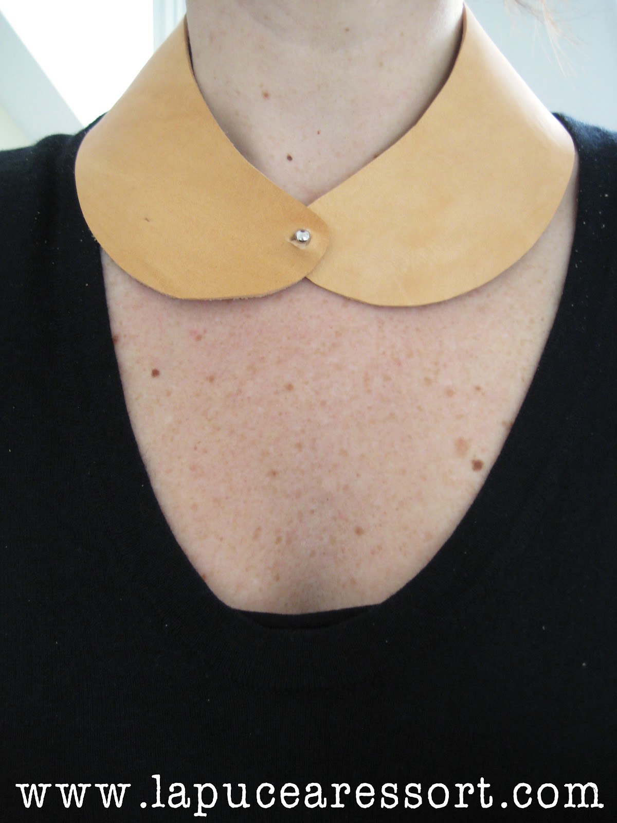 | Col claudine en cuir tanné végétal fermé par un bouton de col et doublé cuir. [Vegetable-tanned leather Peter Pan collar, lined with leather and closed with a metal collar button.] |